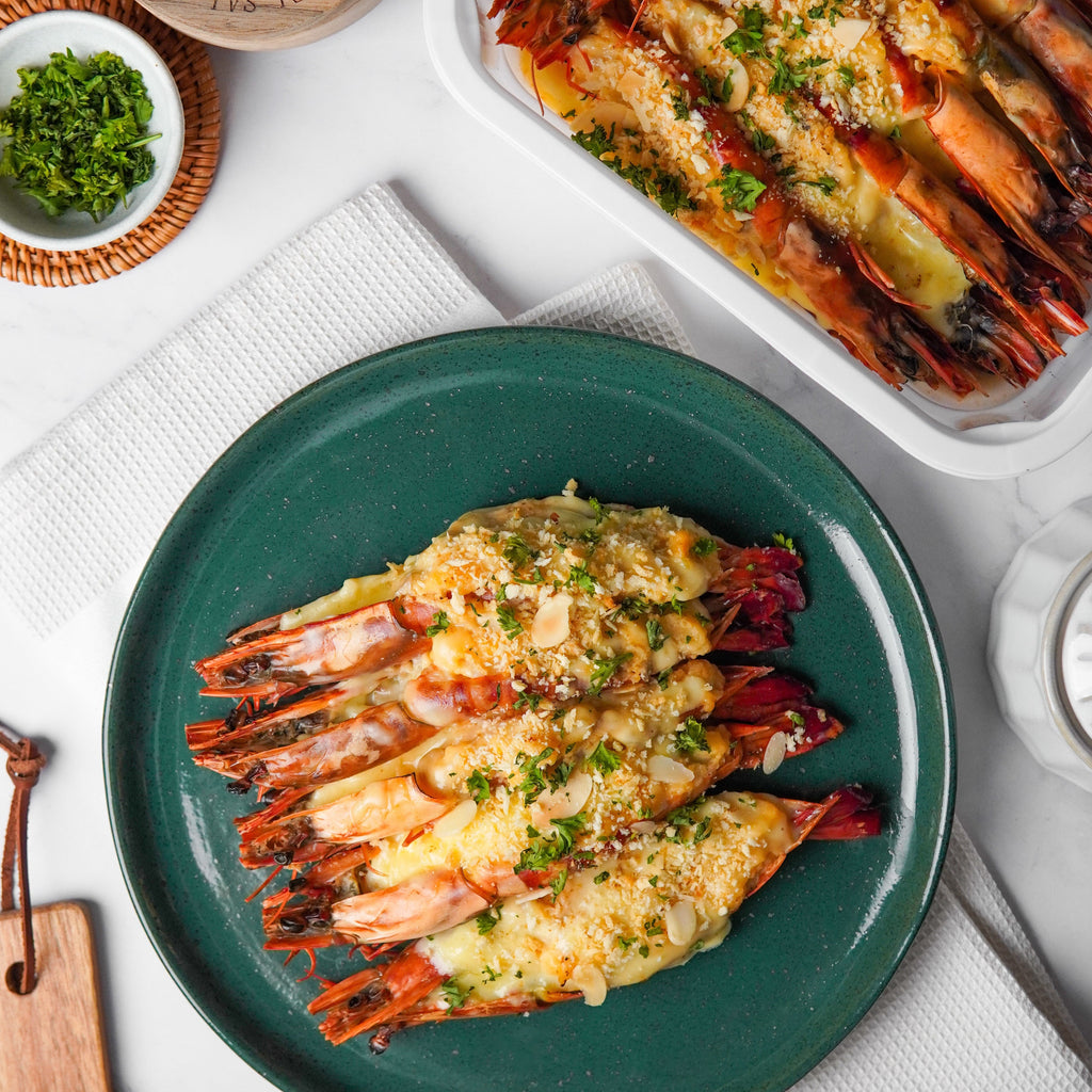 Baked tiger prawns with creamy and buttery mushroom filling with water chestnuts, topped with quickmelt and parmesan cheese.